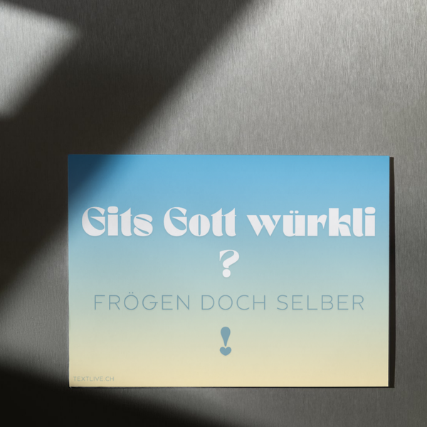 Dieses wetterfeste Plakat mit der Botschaft „Gits Gott würkli – Frögen doch selber“ ist ideal zum Aufhängen an ganz verschiedenen Orten.