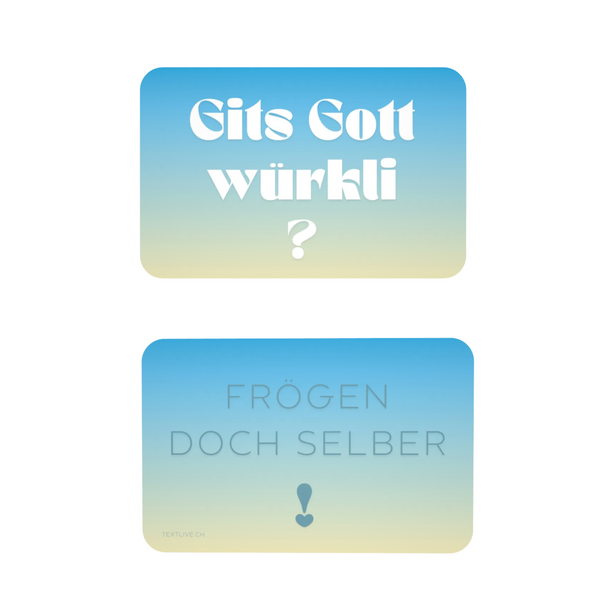 Dieses Kärtchen mit der Botschaft „Gits Gott würkli – Frögen doch selber“ sind ideal zum verteilen.